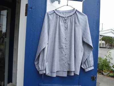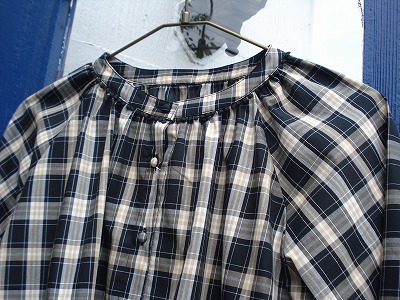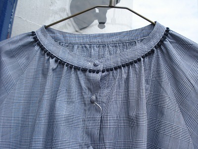前後の衿ぐりにたっぷりとギャザーを入れ、裾に向かってやや広がった
