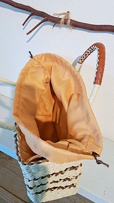 口元は巾着仕様で中が見えないので安心、マチが広く自立します。